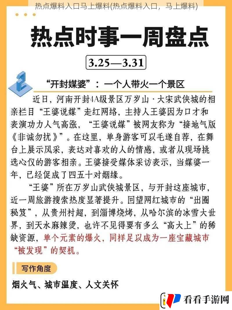 在信息爆炸的时代,热点事件层出不穷,人们对于了解最新的热点话题和事件充满了渴望。而热点爆料入口马上爆料则成为了满足这一需求的重要途径。将深入探讨热点爆料入口马上爆料的相关内容。